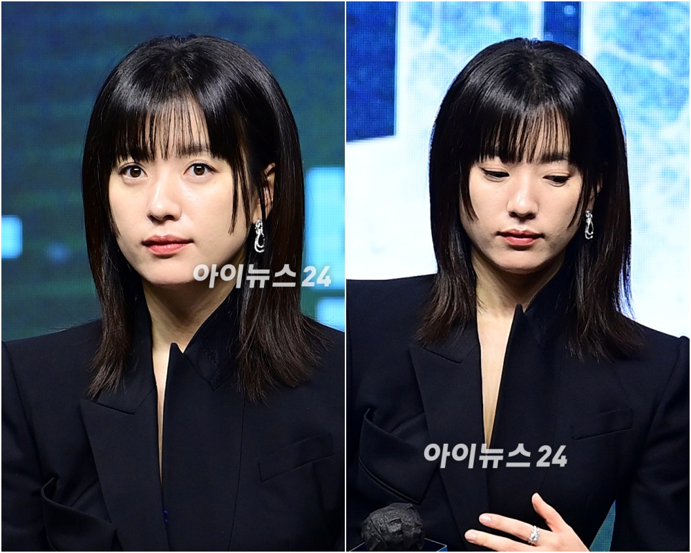 배우 한효주가 8일 오전 서울 여의도 콘래드서울에서 열린 디즈니+ 오리지널 시리즈 '지배종' 제작발표회에 참석하고 있다.