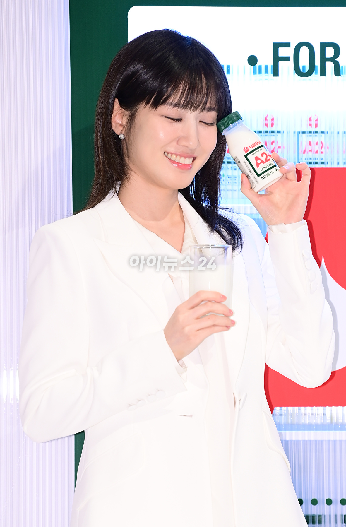 배우 박은빈이 15일 오전 서울 용산구 그랜드하얏트서울에서 열린 '우유로 세상을 건강하게' 서울우유 A2+출시 행사에 제품 모델로 참석해 포토타임을 갖고 있다.