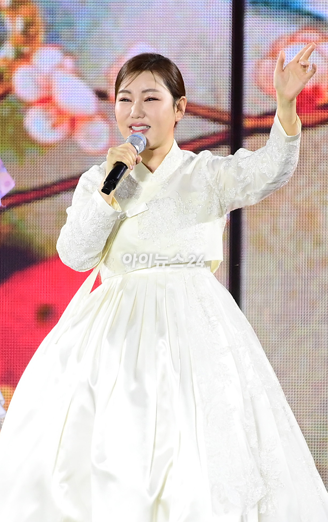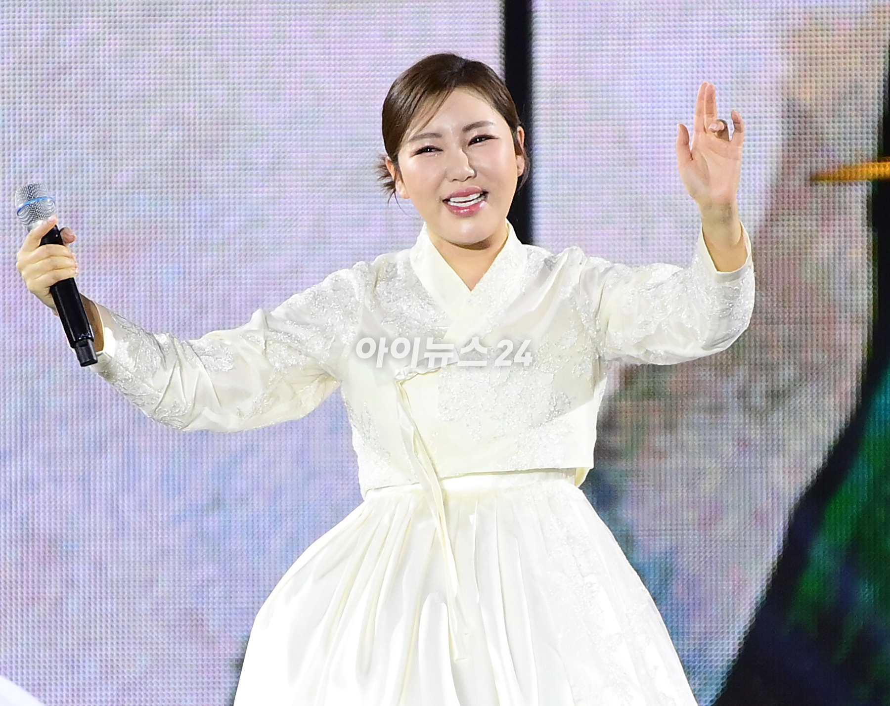 가수 송가인이 21일 오후 서울 종로구 경복궁 흥례문 광장에서 열린 '2024 코리아 온 스테이지-뉴 제너레이션'에서 멋진 무대를 선보이고 있다. 이날 행사는 '문화재청'이 '국가유산청'으로 새롭게
