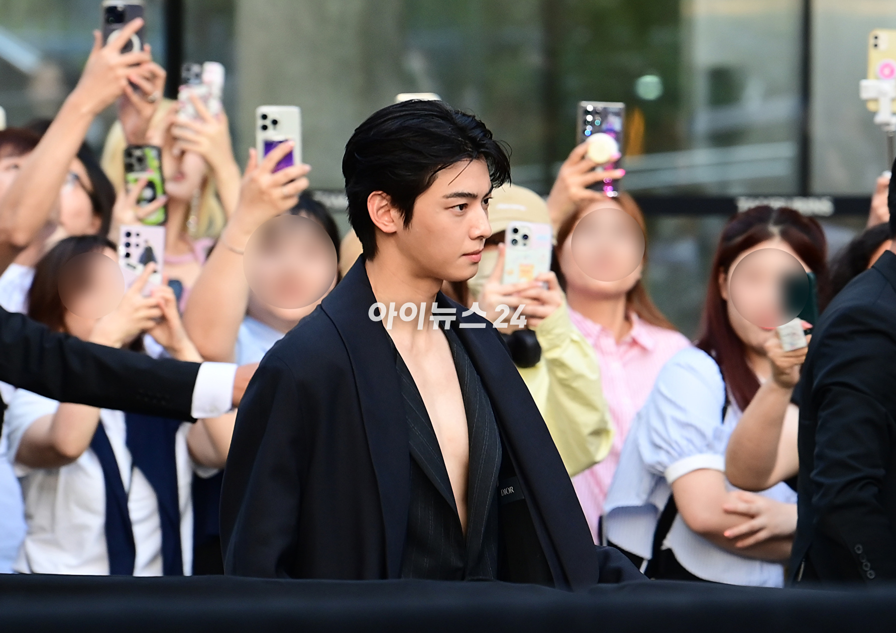 배우 차은우(아스트로)가 29일 오후 서울 성동구 성수동 인근에서 진행된 디올(DIOR) 디올리비에라 컬렉션 포토콜에 행사에 참석하고 있다.