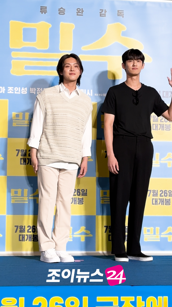 배우 장도윤, 손현우가 지난 20일 오후 서울 강남구 삼성동 메가박스 코엑스점에서 열린 영화 '밀수'(감독 류승완) VIP 시사회에 참석해 포즈를 취하고 있다.