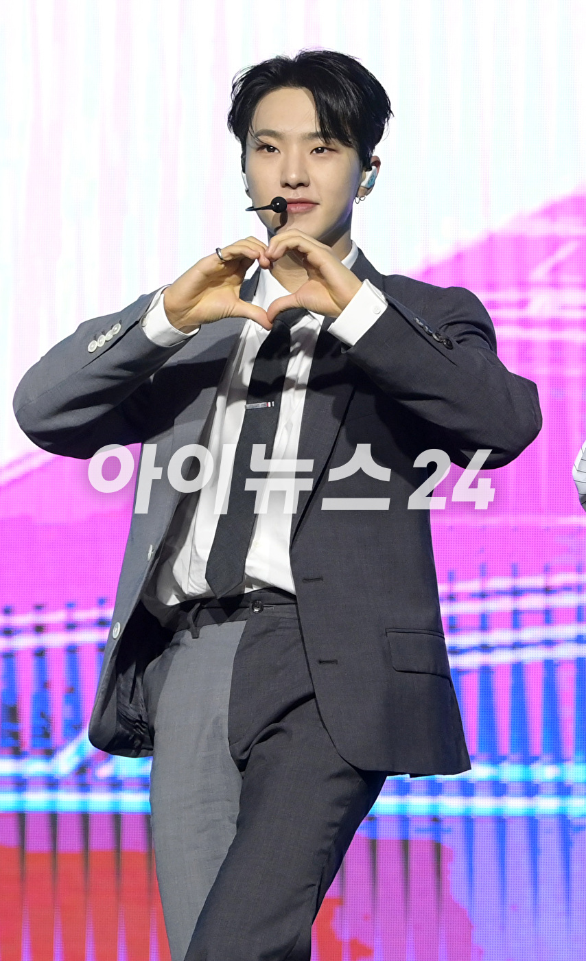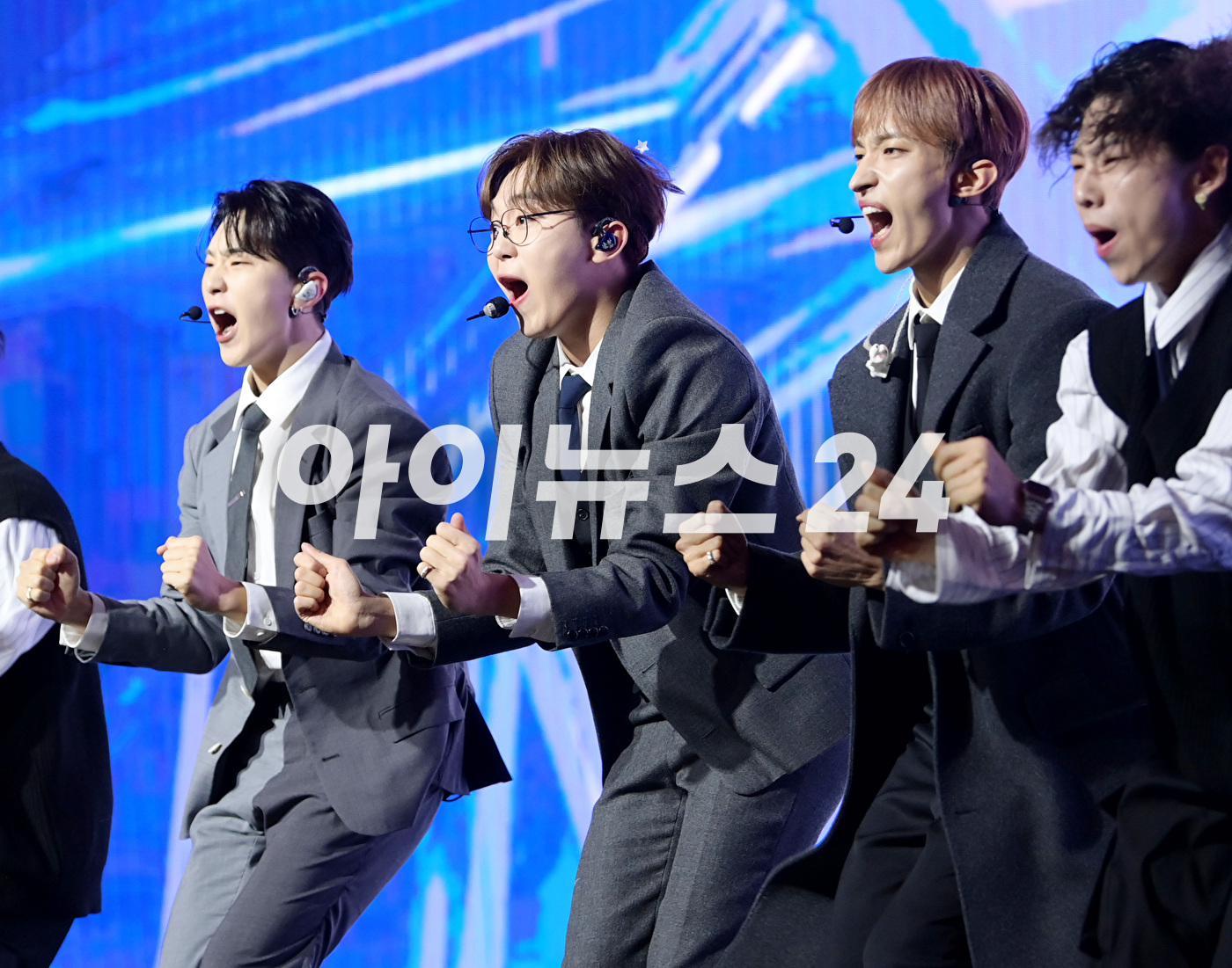 세븐틴의 유닛 그룹 부석순(승관, 호시, 도겸)이 10일 오후 서울 용산구 그랜드하얏트 서울 그랜드볼룸에서 열린 도드람 2022~2023 V-리그 시상식에 참석해 축하공연을 선보이고 있다.