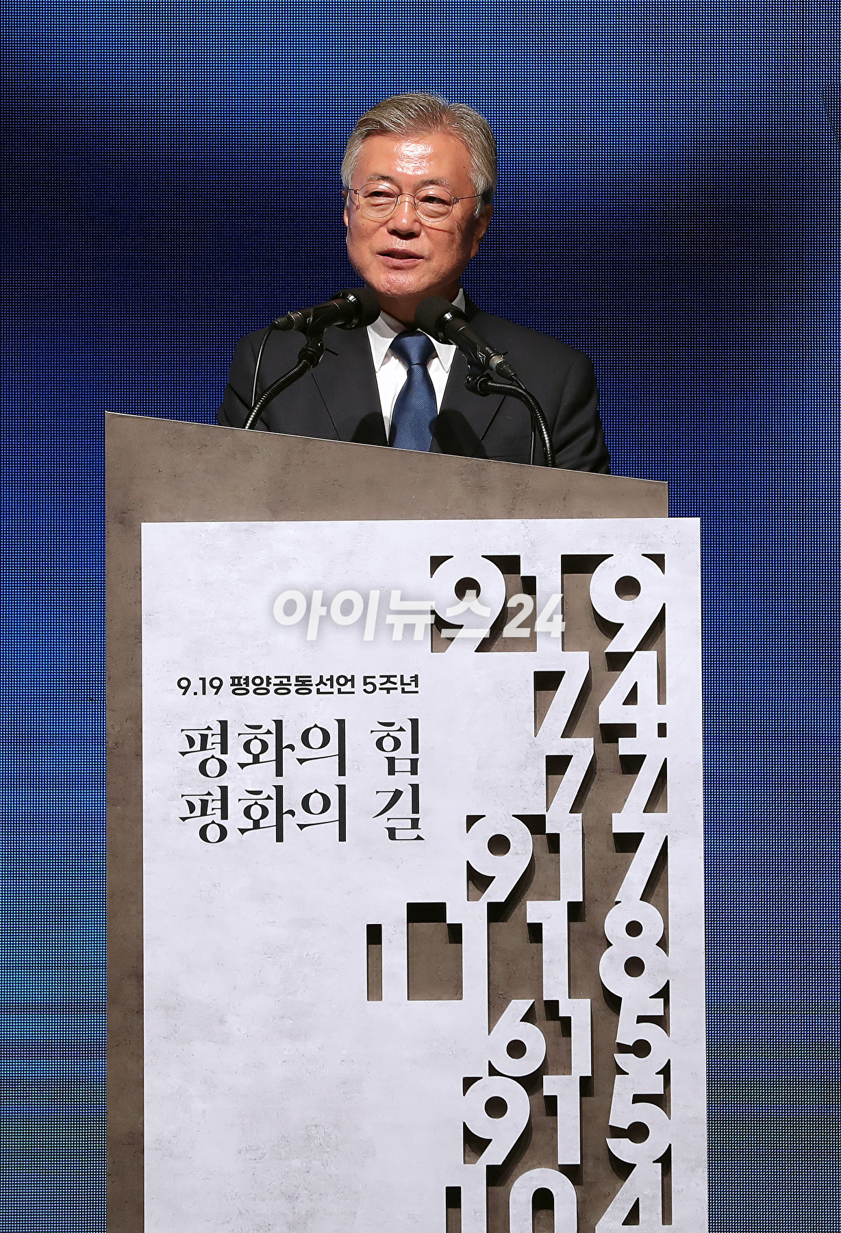 19일 오후 서울 여의도 63빌딩에서 열린 '9.19 평양공동선언 5주년 기념, 평화의 힘 평화의 길' 기념식에서 인사말을 하고 있다.