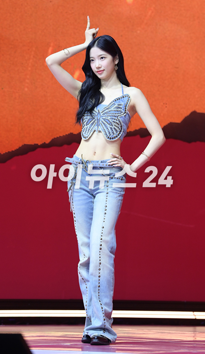 그룹 르세라핌 카즈하가 1일 오후 서울 광장동 예스24라이브홀에서 열린 르세라핌(LE SSERAFIM) 첫 번째 정규 앨범 '언포기븐'(UNFORGIVEN) 미디어 쇼케이스에 참석해 포즈를 취하고 있다.