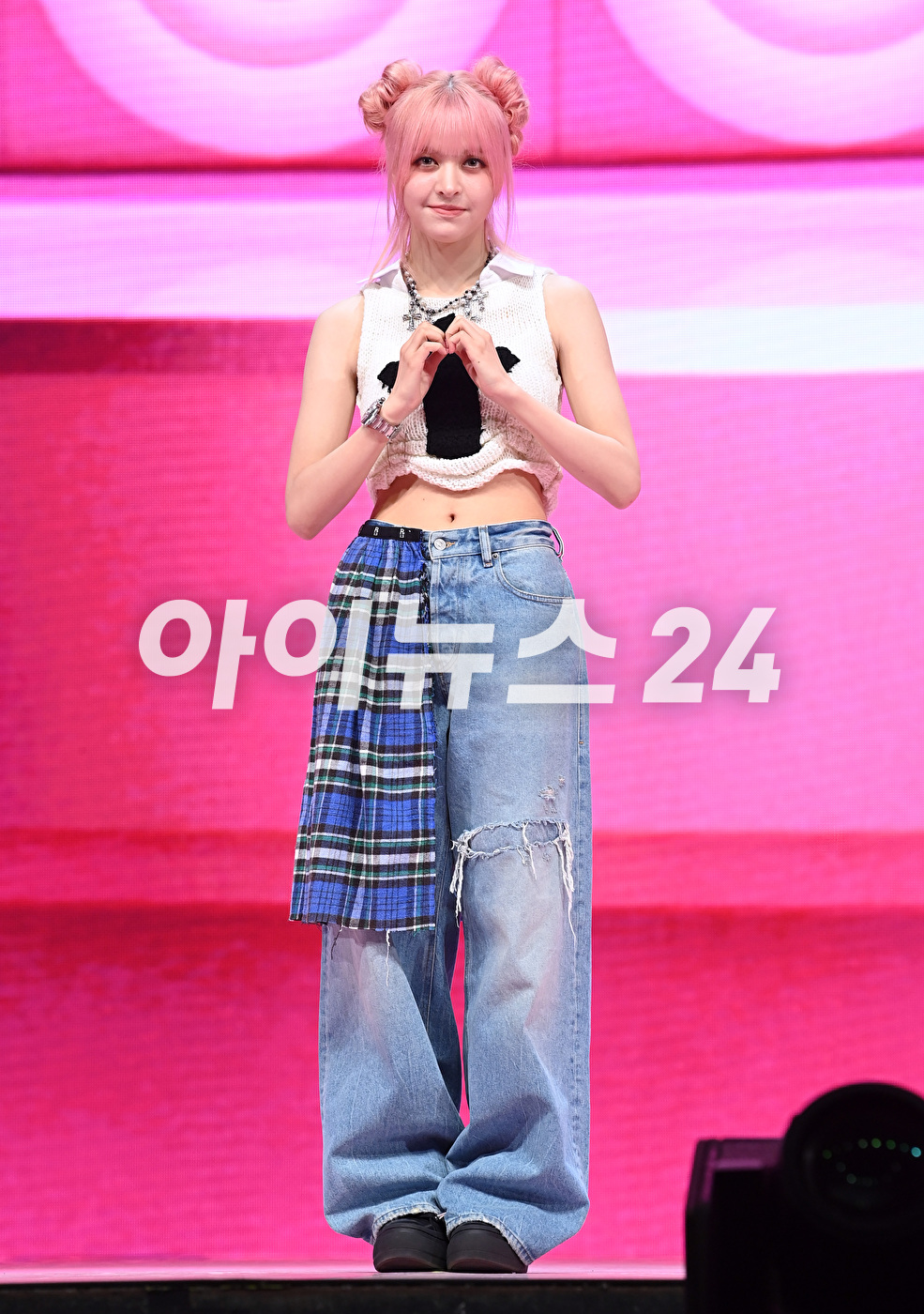 그룹 엔믹스(NMIXX) 해원이 20일 오후 서울 광진구 예스24라이브홀에서 열린 첫 번째 미니앨범 '엑스페르고'(expergo) 발매 기념 쇼케이스에서 포즈를 취하고 있다.