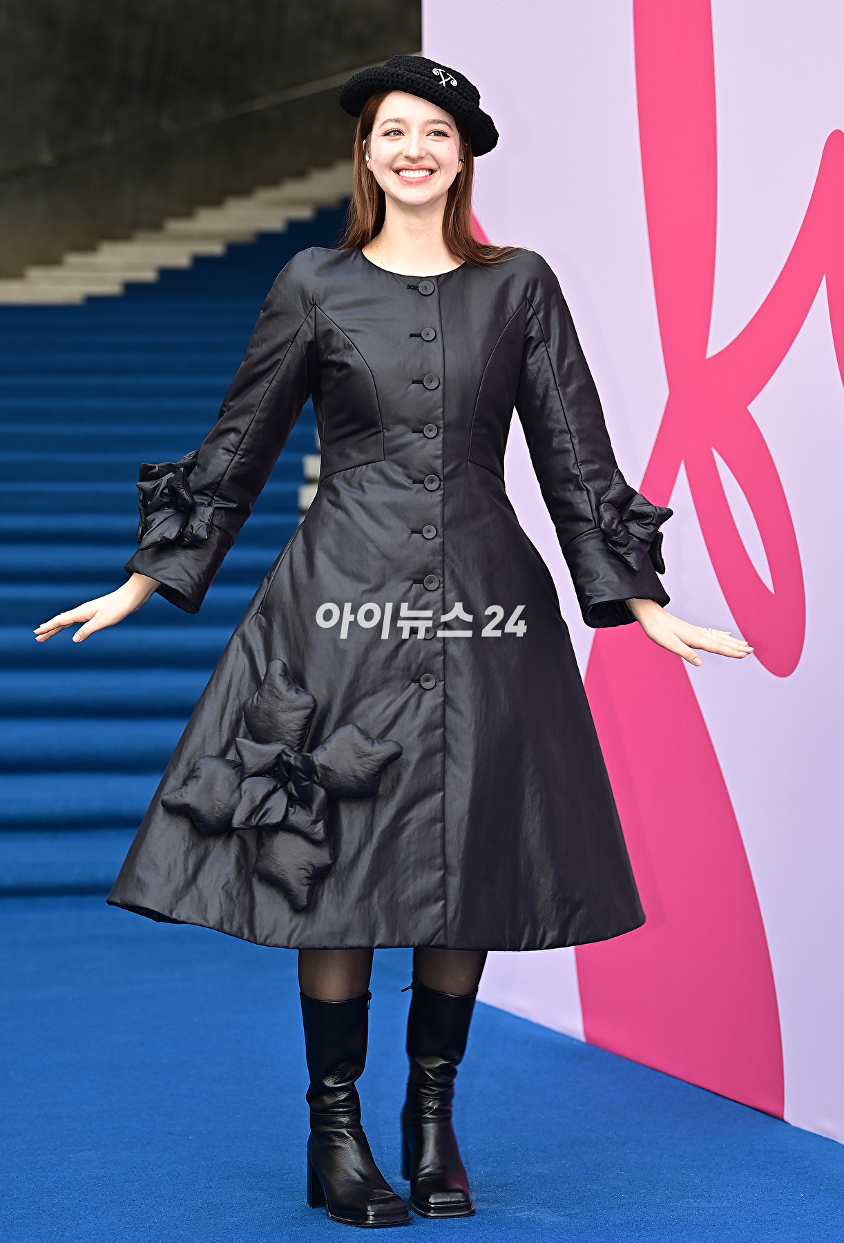 모델 안젤리나 다닐로바가 1일 오후 서울 중구 동대문디자인플라자에서 열린 2024 가을/겨울(F/W) 서울패션위크 박소영 디자이너의 '줄라이칼럼'에 참석해 포토타임을 갖고 있다.