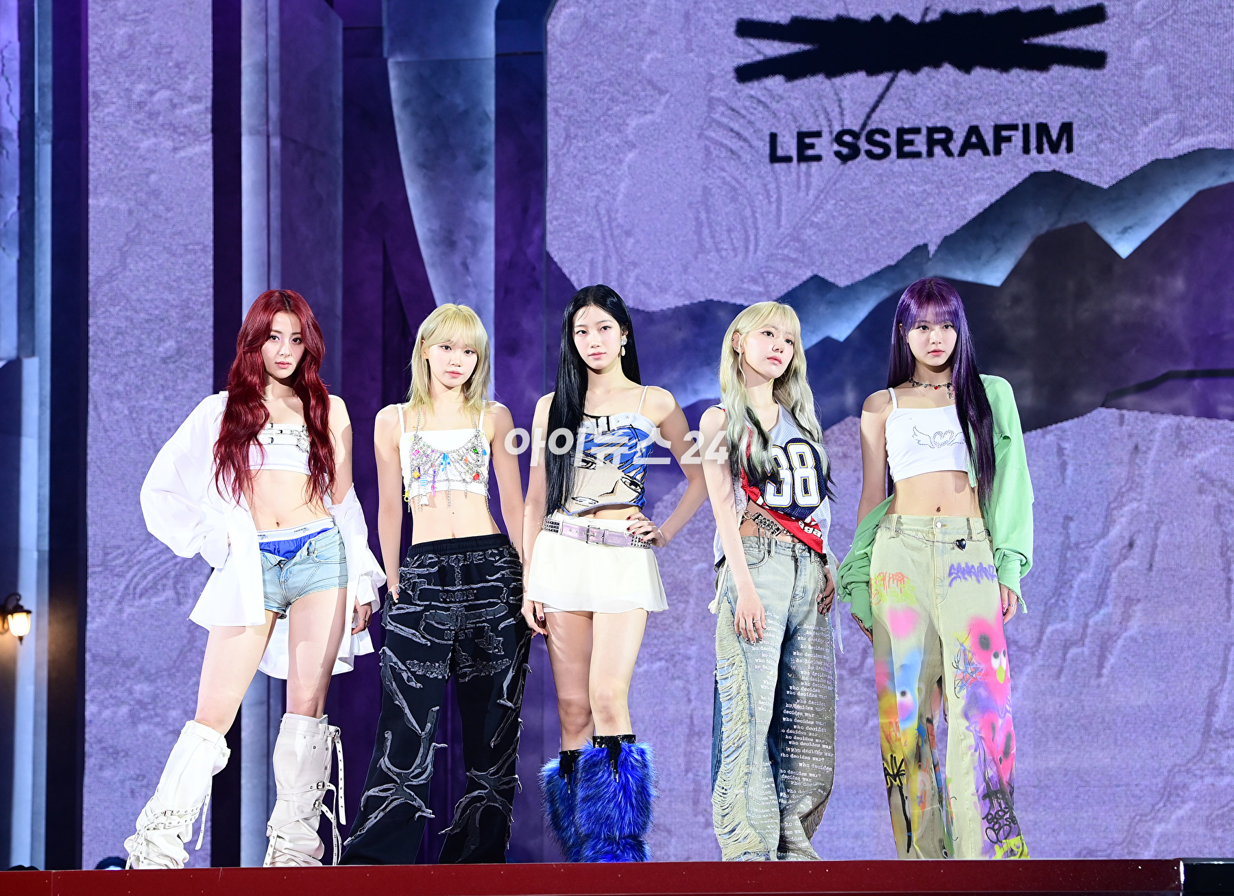 그룹 르세라핌이 19일 오후 서울시 성북구 안암동 고려대학교 화정체육관에서 열린 르세라핌(LE SSERAFIM) 미니 3집 '이지(EASY)' 발매 기념 쇼케이스에서 수곡 'Swan Song' 무대를 선보이고 있다. [사진=정소희 기자]