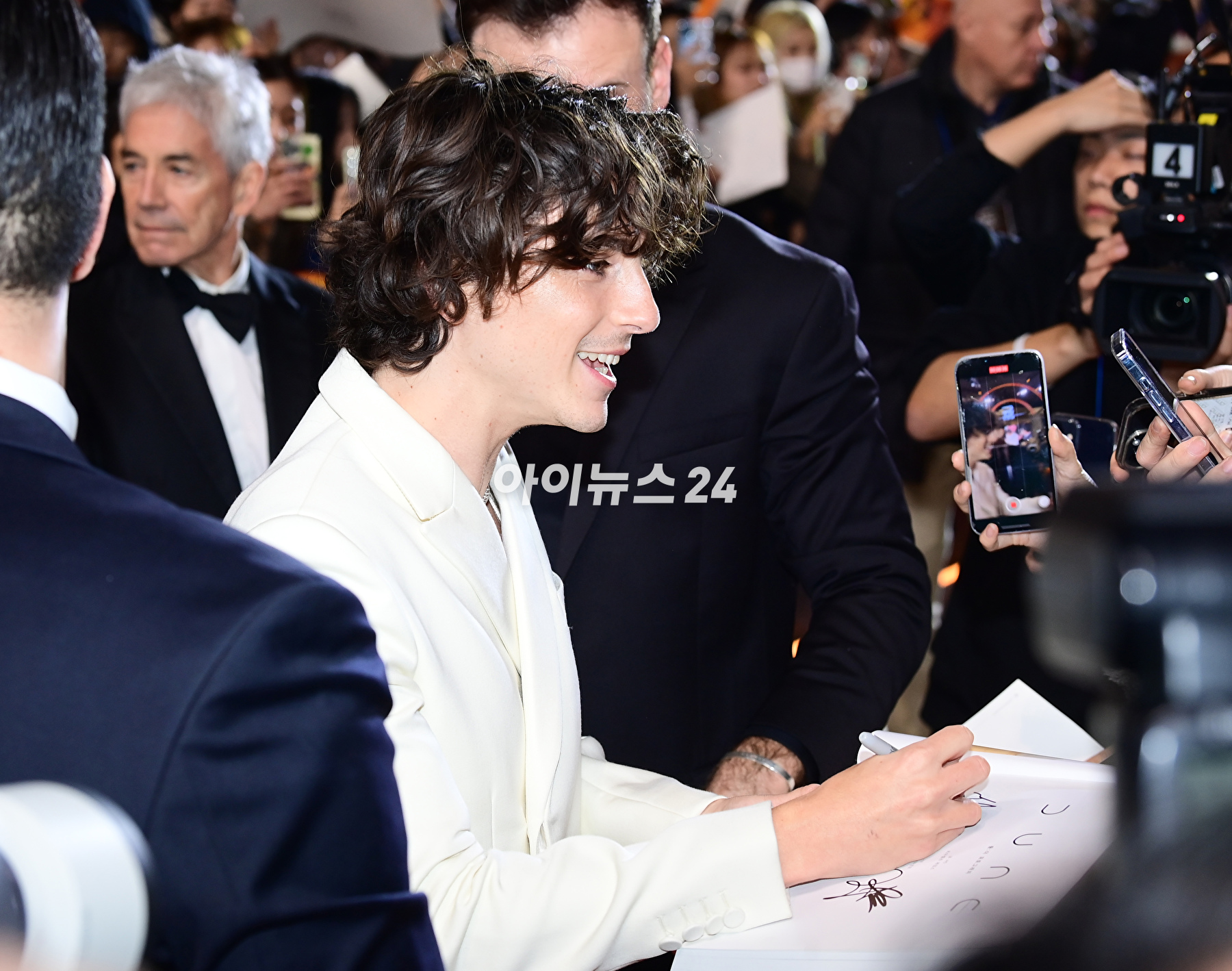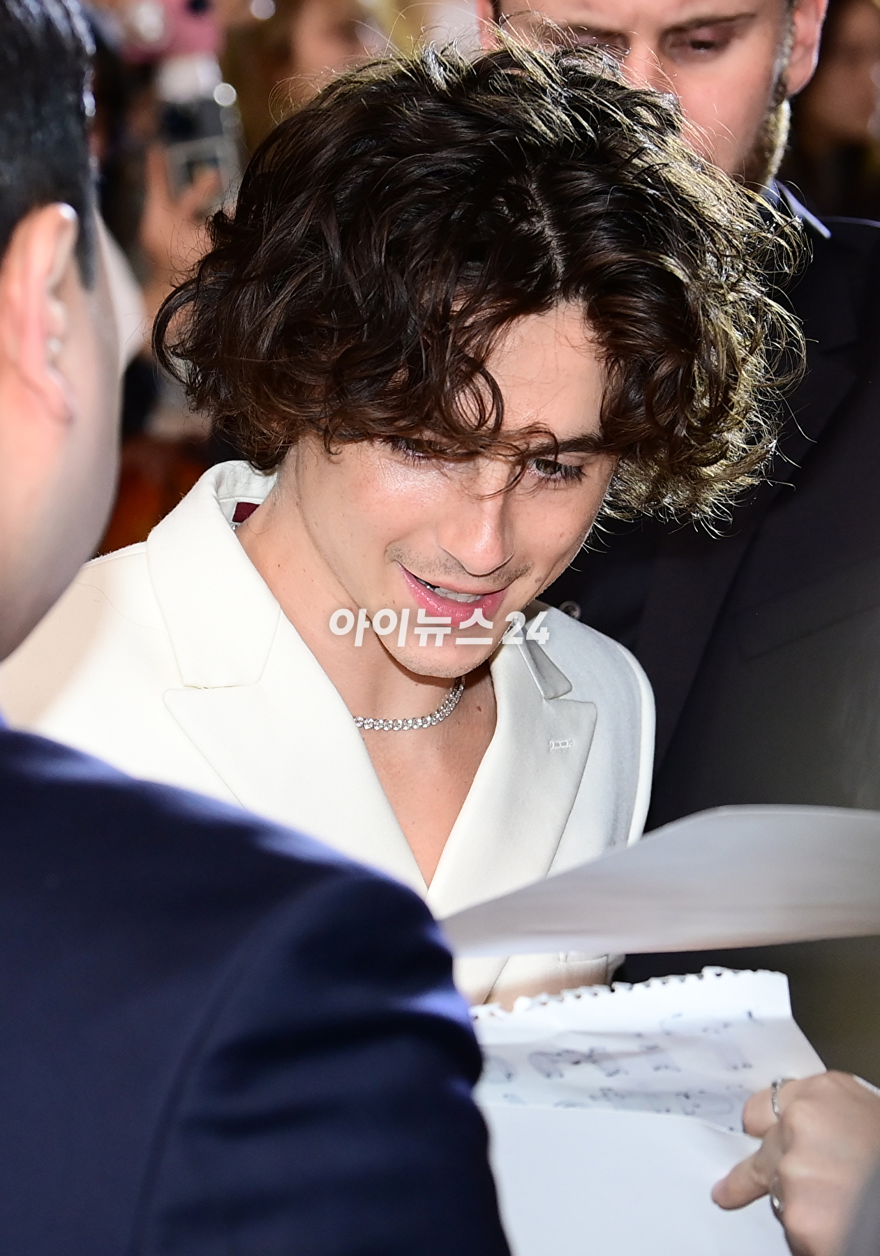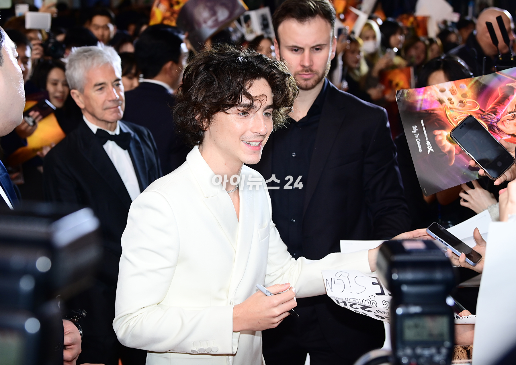 배우 티모시 샬라메가 22일 오후 서울 영등포구 타임스퀘어에서 진행된 영화 '듄: 파트2' 내한 레드카펫 행사에 참석해 다정한 팬서비스를 보여주고 있다.